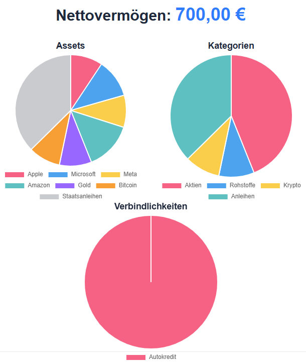 Verteile dein Geld auf verschiedene Anlageklassen und sieh sofort, wie ausgewogen dein Portfolio ist. Unser Tool zeigt dir, ob du zu viele Eier in einem Korb hast oder breit genug streust. Außerdem führt unser Tool alle Assets und eventuelle Verbindlichkeiten zusammen und zeigt deinen Nettovermögensstand auf einen Blick.