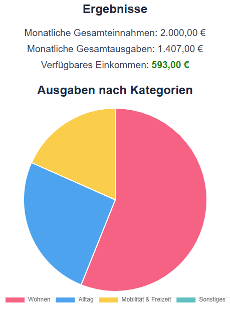 Verfolge monatliche Einnahmen und Ausgaben in Sekundenschnelle. Unser Haushaltsrechner verschafft dir einen klaren Überblick, wo dein Geld hingeht, und zeigt dir sofort dein verfügbares Einkommen.